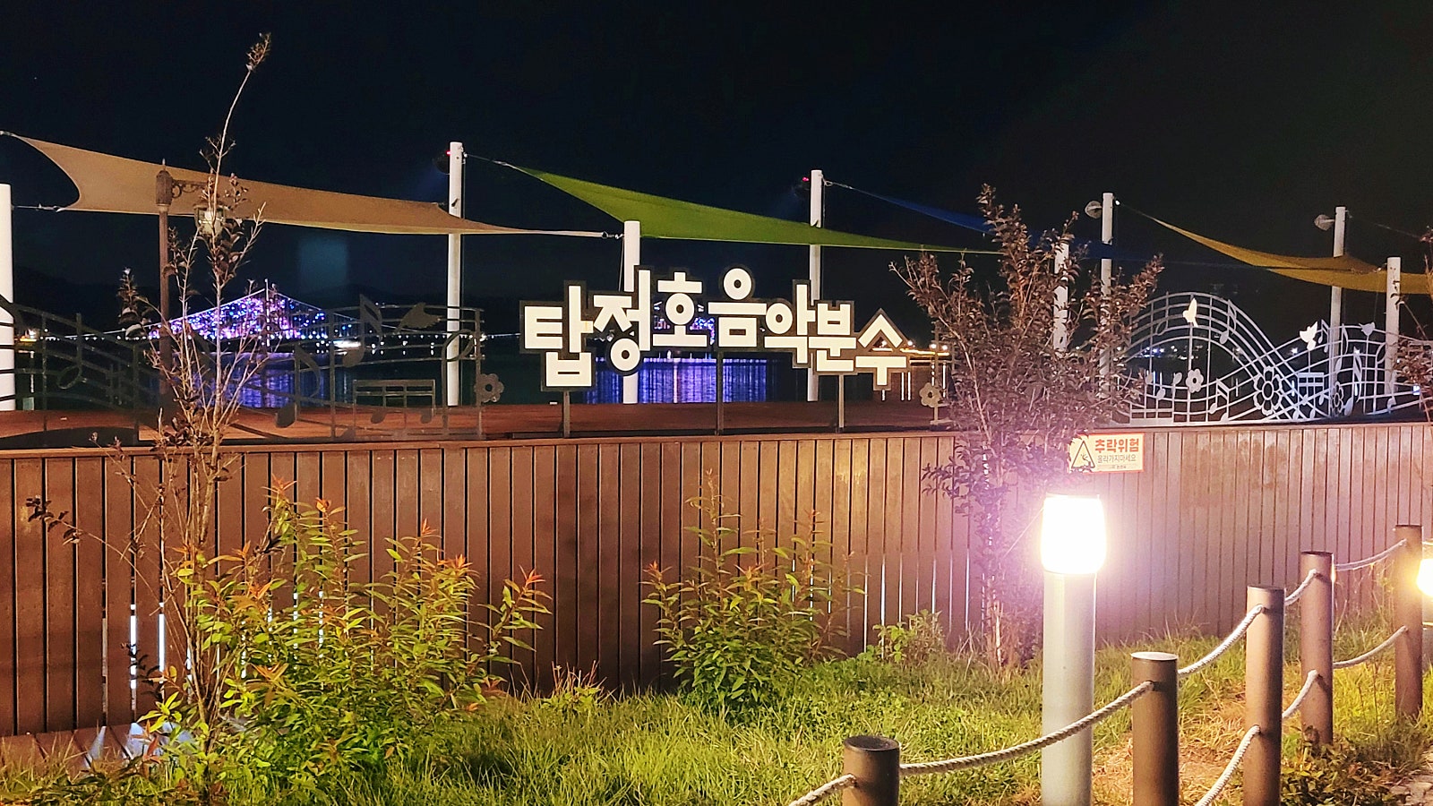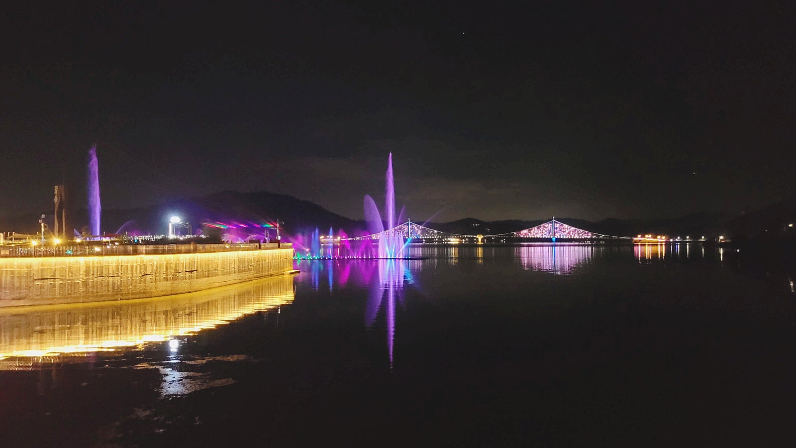 야간에는 출렁다리에 조명이 밝혀지고 12월 ~ 3월까지 결빙기를 제외하고 일몰 시간에 맞춰 음악과 함께 물보라가 화려한 불빛과 조화를 이루며 다양한 모양과 색상으로 밤하늘을 아름답게 수놓고 있습니다.