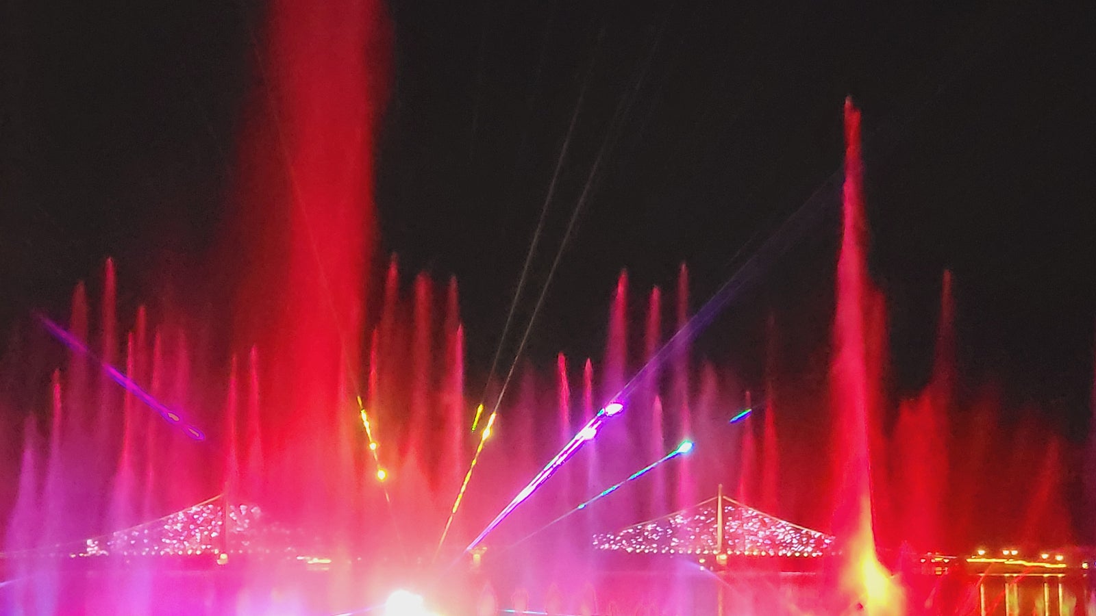 공연이 끝나면서 음악분수 쇼가 시작되었습니다. 밤하늘에 아름다운 색상과 다양한 조명으로 시원한 물줄기가 뿜어 올라가며 멋진 볼거리를 만들어 줍니다.