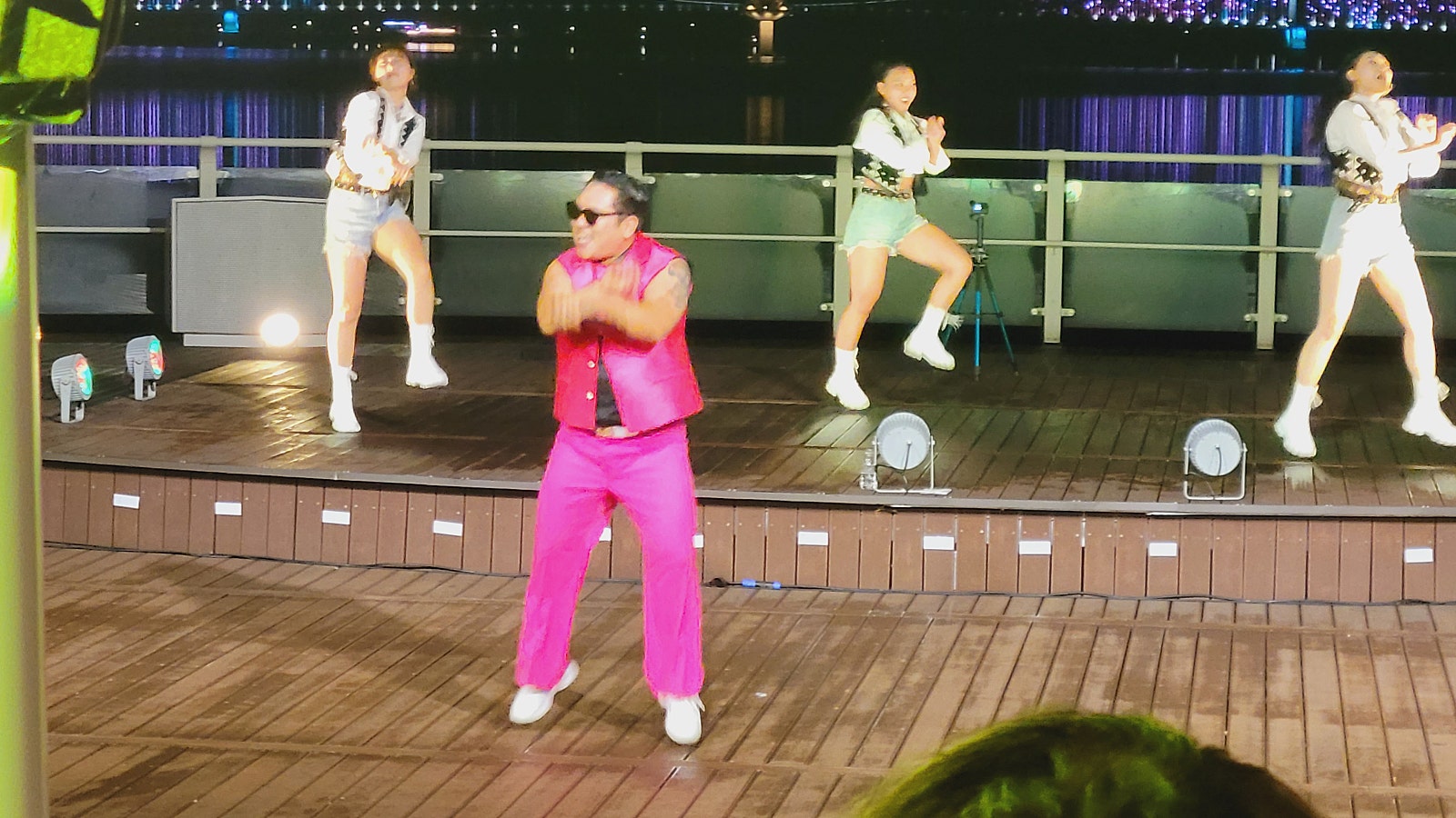 가수 싸이를 닮은 '팀 싸이렌'이 싸이의 노래를 춤과 함께 공연하는데 싸이와 꼭 닮은 춤과 목소리가 마치 유명한 가수 싸이가 나온 듯합니다. 세계적 히트곡인 '강남스타일'을 부르며 춤을 추자 객석은 모두 함께 소리를 지르며 춤을 춥니다. 무대와 객석이 하나 되는 가을밤의 음악분수공원이 행복한 시민들로 가득한 것 같습니다.