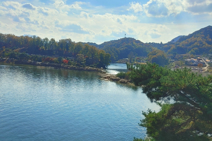 테크 옆에는 푸른 대청호와 함께 하는 부소담악의 일부가 보이기 시작했습니다.