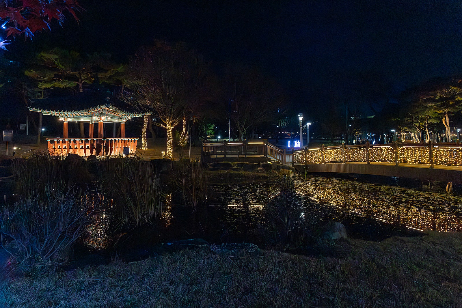 은은한 조명이 어두운 밤하늘을 따스하게 밝혀주고, 다리를 수놓은 은하수 조명이 연못 위에 반사되어 마치 별빛이 물결치는 듯한 환상적인 풍경을 연출합니다.