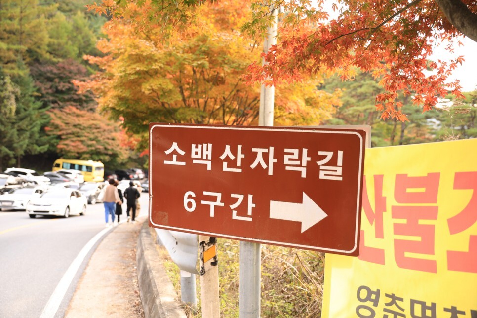 보발재를 넘어서 구인사로 가는 길에 약 3㎞ 도로변을 따라 예쁘게 물든 단풍이 소백산의 산세와 조화를 이루면서 절경을 보여줍니다.