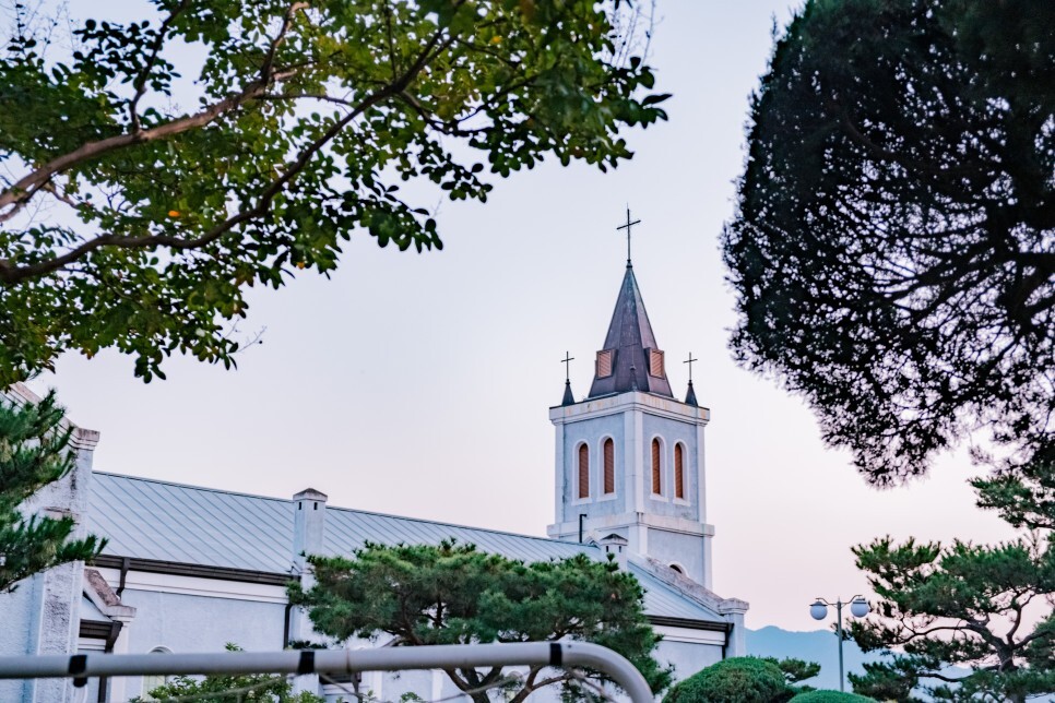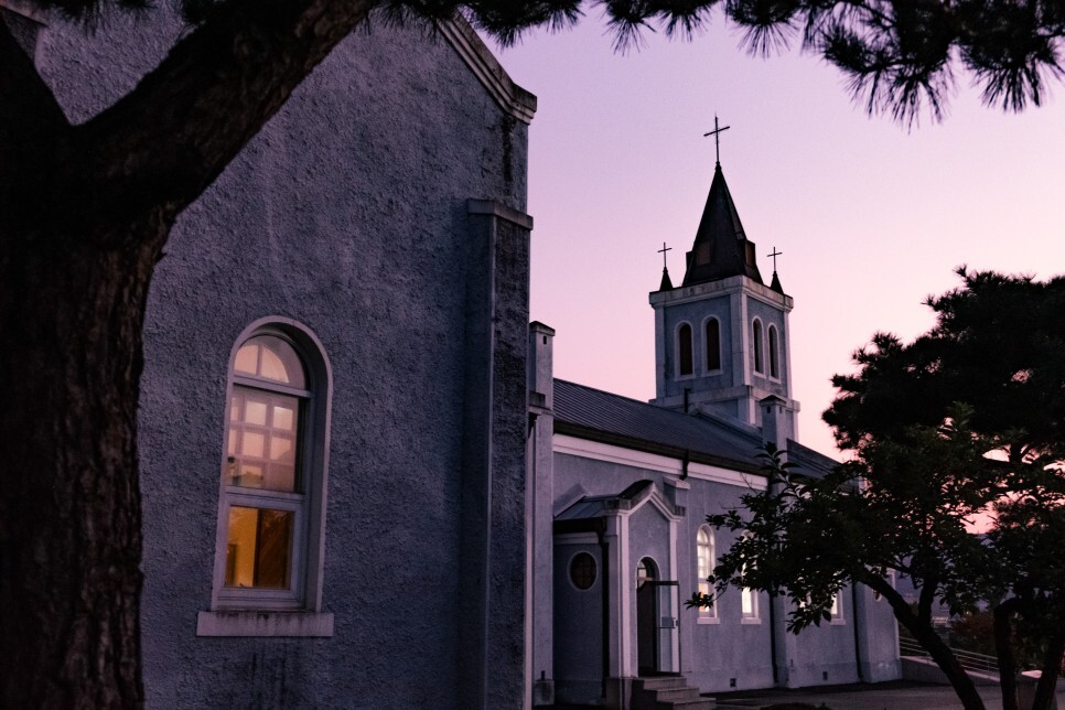 어느 시간대에 찾아가든 예쁘지만, 해가 질 무렵엔 옥천성당의 또 다른 매력을 발견할 수 있는데요. 하얀 벽에 비치는 보랏빛 하늘색이 아름답습니다.