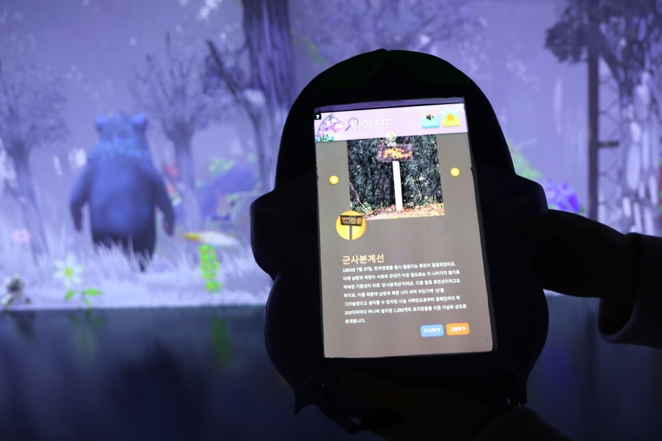 체험존에 들어가 마이크에 대고 ‘ 거기 누구 계세요?’라고 외치면 ‘ 너 누구야, 나는 DMZ에 사는 반달가슴곰이야.’라고 메아리가 울려 아이들이 재미있게 체험할 수 있는데요. DMZ 지역으로 인해 이산가족이 만나지 못하는 사실들을 어린이들이 쉽게 이해할 수 있도록 만든 체험형 전시입니다.