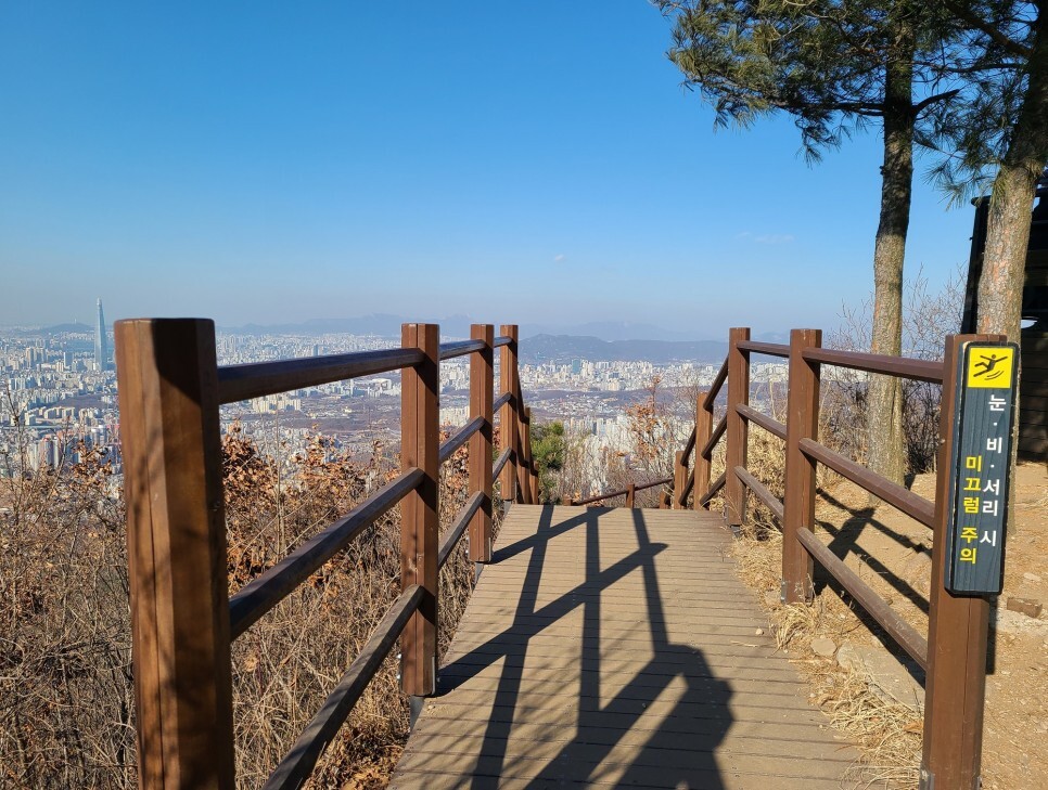 약 1,200계단을 훌쩍 넘기고야 드디어 서문 전망대에 다다랐습니다! 나무 계단은 남한산성 등반로를 더 원활하게 이용하기 위해 경기도와 하남시, 송파구 세 곳이 협조하여 설치한 것으로 2019년 12월 10일에 완공한 것인데요. 나무계단길 오르는 길 역시 쉽지 않았지만, 계단길이 없이 올랐다면 더욱 힘들게 올랐을 것을 생각해보면 오히려 정비된 계단 길에 감사하게 되었습니다.