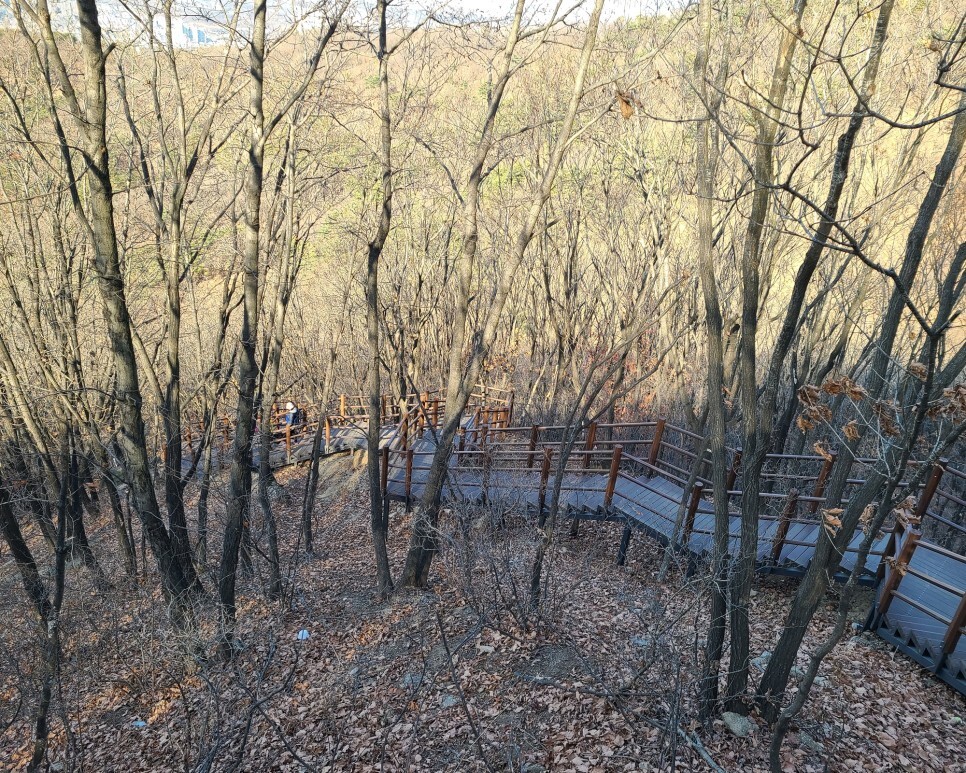 묵묵히 걷다가 고개를 들어 보면 겨울을 맞은 나무들의 모습 사이로 위례지구의 풍경이 보였는데요. 계단을 걷다가 지칠 때면 만날 수 있는 쉼터에서 잠시 쉬기도 하면서 천천히 올라가 보았습니다. 올라왔던 길을 돌아보니 제법 많이 올라온 것 같아 힘이 났는데요. 곧 도착할 서문 전망대를 향해서 힘차게 전진해보았습니다.