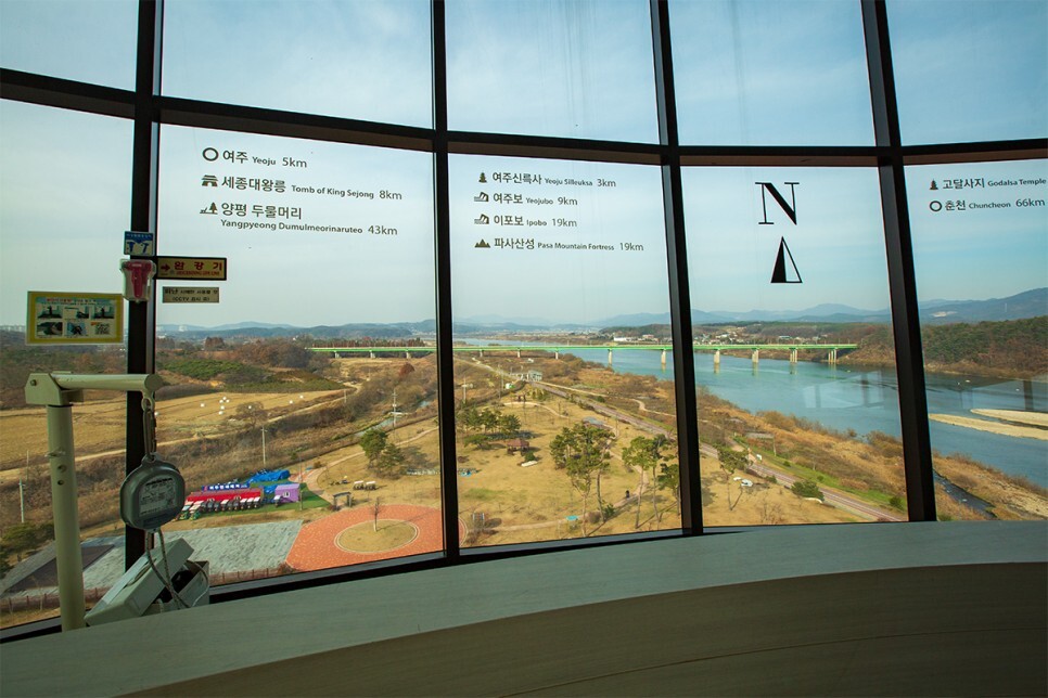한강문화관에 방문하셨다면 전망대를 꼭 올라가 보세요. 11층 높이에서 보는 뻥 뚫린 강천보와 남한강 풍경은 여주 34코스 트래킹의 아름다운 마무리가 될 거예요.