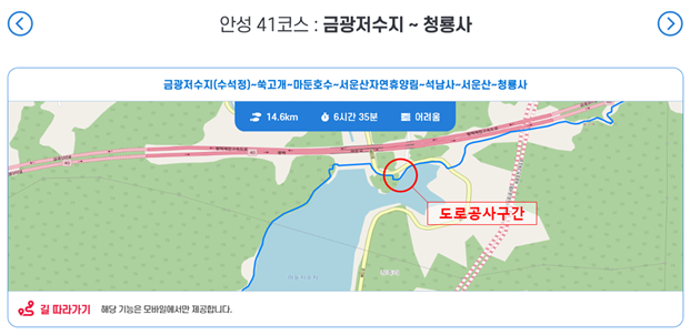 현재 안성 41코스 마둔호수 구간 일부에서 도로공사가 진행되고 있습니다. 공사가 끝나기 전까지는 임시 우회로를 이용해 안성 41코스를 즐겨주세요.