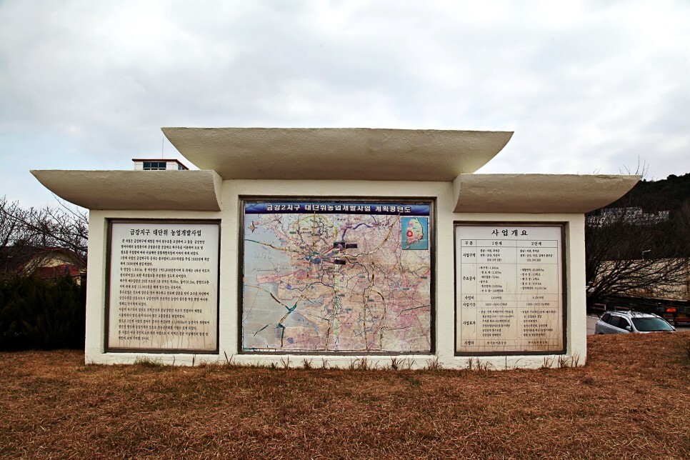 금강하구둑 입구에는 금강2지구 대단위 농업계발사업에 대한 현황이 기록되어 있습니다.