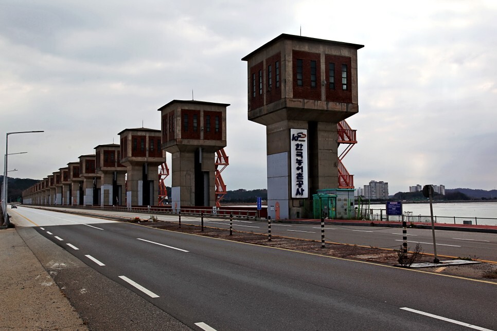 왼쪽에는 금강물을 서해로 흘려보내는 배수관문이 서 있는 모습입니다.