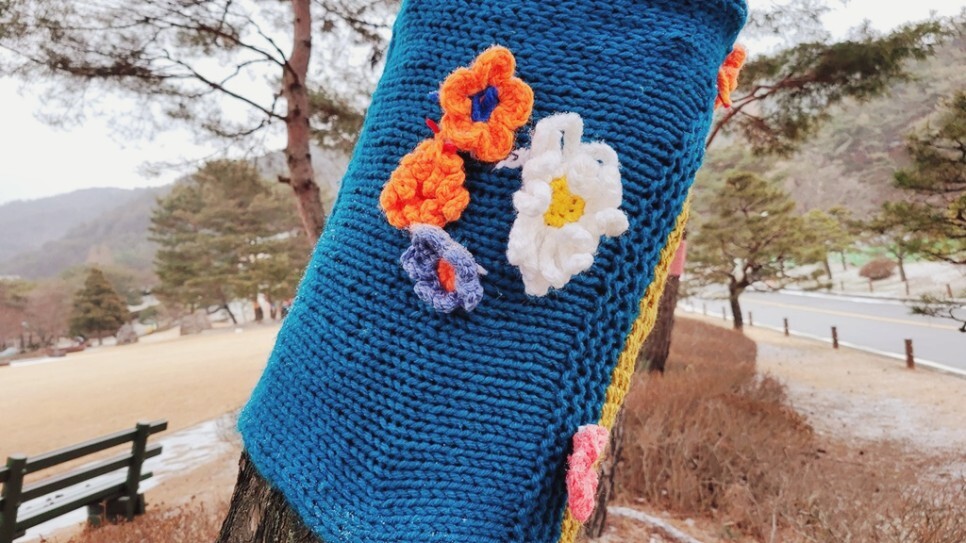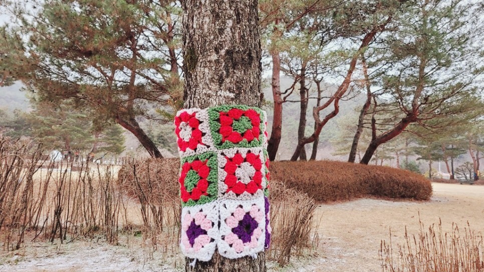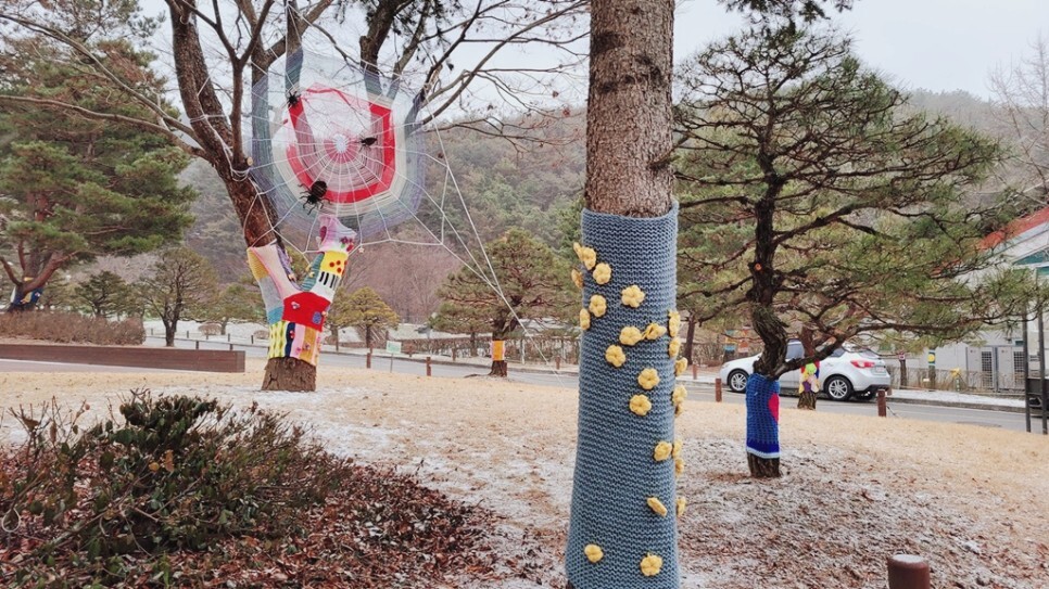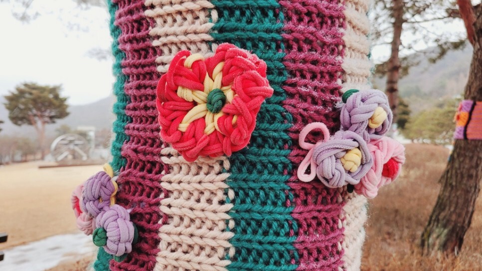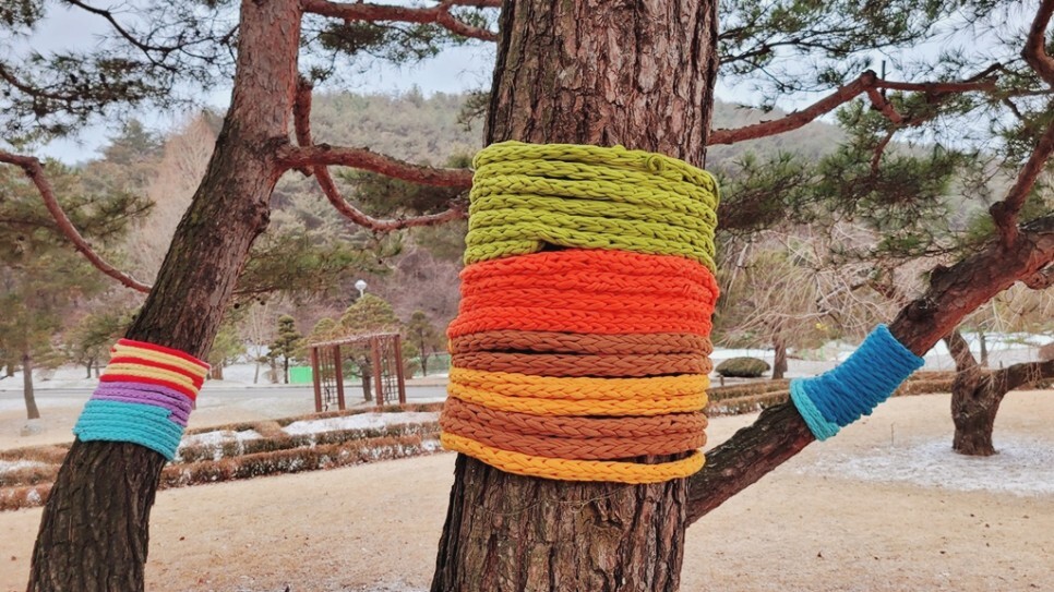 추운 겨울을 맞이하여 미동산 수목원의 나무들이 화사한 뜨개 옷을 입었습니다.