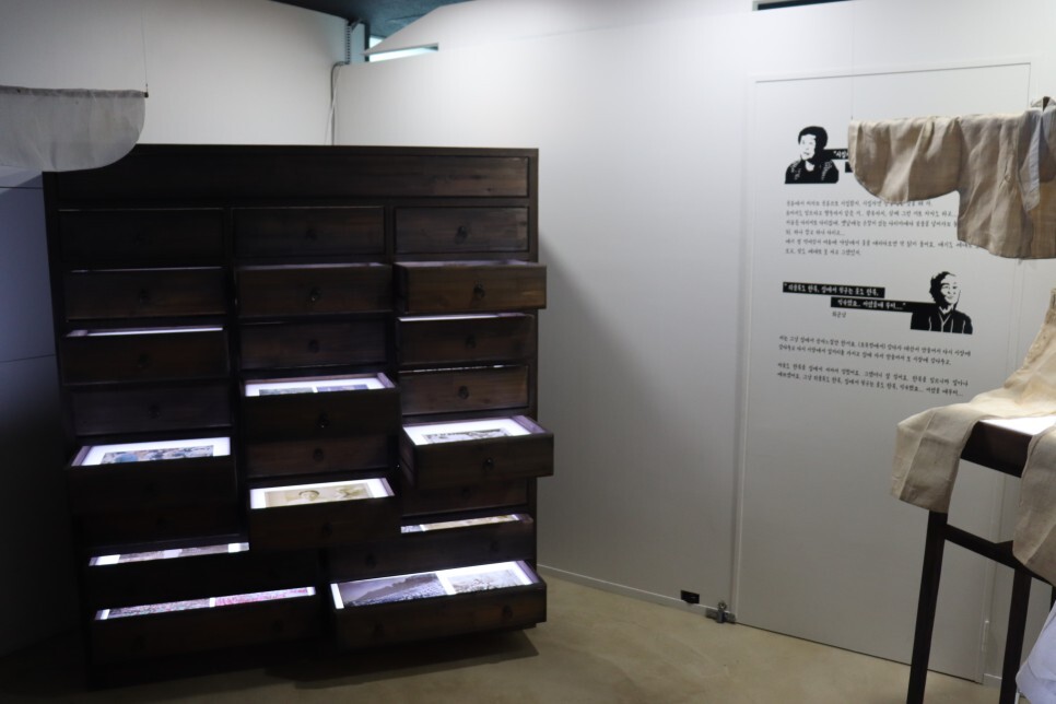 남원다움관 상반기 특별 전시 ‘천의 기억, 짓.다’에 이은 두 번째 이야기인 ‘천의 기억, 짓.다2’는 일제강점기부터 현대에 이르기까지 남원여성의 삶을 한복이라는 ‘일상’과 연계해 풀어낸 전시입니다. 우연찮게 작가님이 바닥에 작품을 그리는 모습도 만날 수 있었는데요, 바닥에 정성껏 드로잉 하는 모습이 인상적이었습니다.