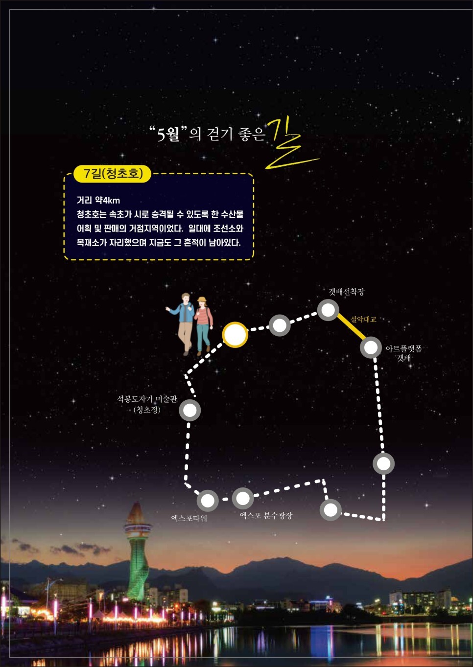 5월 걷기 좋은길은 사잇길 7길 청초호길로 청초호 둘레길을 한바퀴 도는 코스로 5월에 피는 튤립의 향연과 아름다운 야경을 함께 볼수 있습니다. 청초호 둘레길은 대략 1시간에서 1시간 30분 정도 소요됩니다.