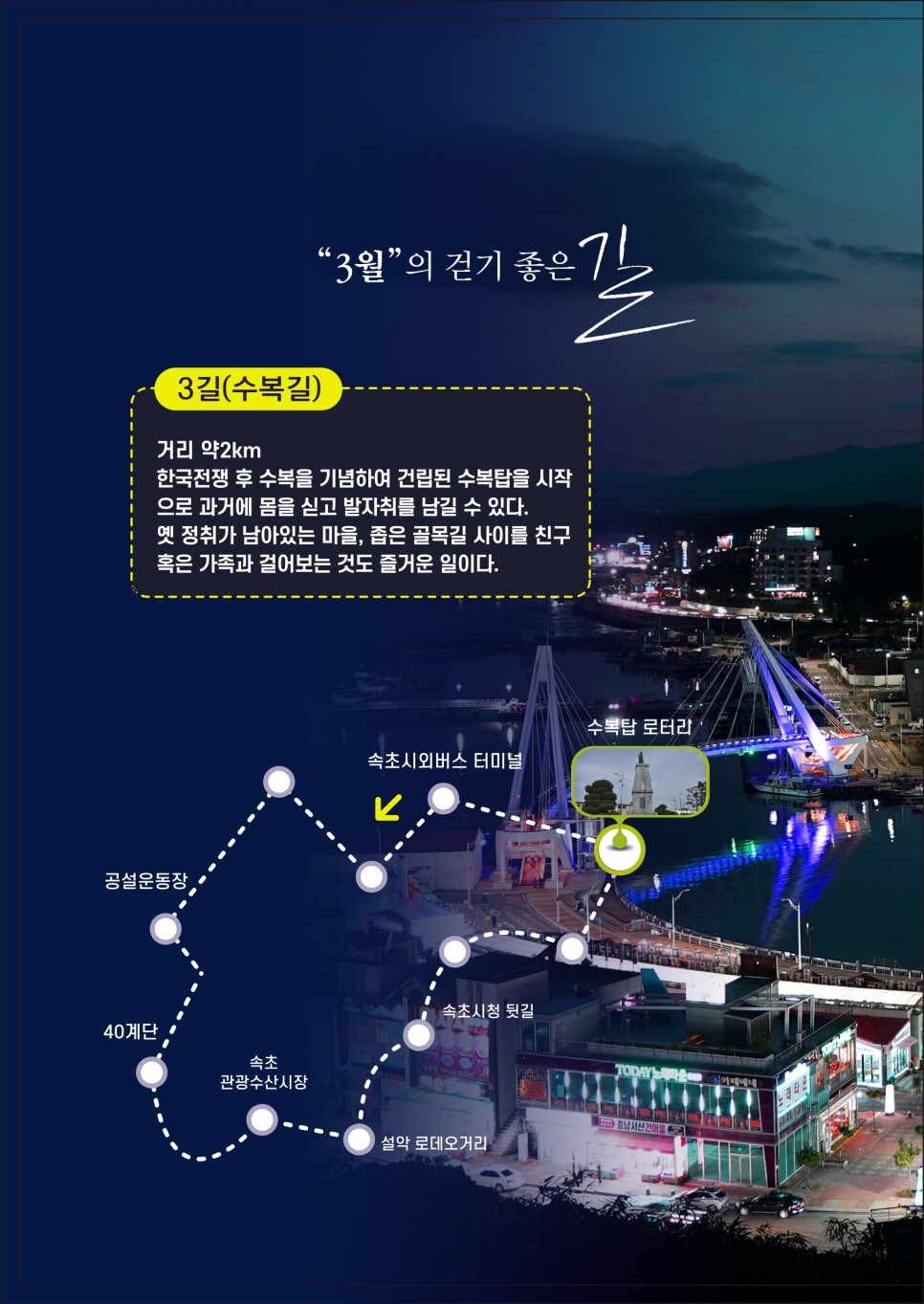 3월 걷기 좋은길은 3길 수복길로 한국전쟁 후 수복을 기념하여 건립된 수복탑을 시작으로 하여 골목길을 따라 사이렌 마을 ,속초중앙시장,40계단 마을을 거쳐 속초터미널을 거쳐 돌아오는 길로 속초의 문화를 그대로 느낄수 있는 곳입니다.