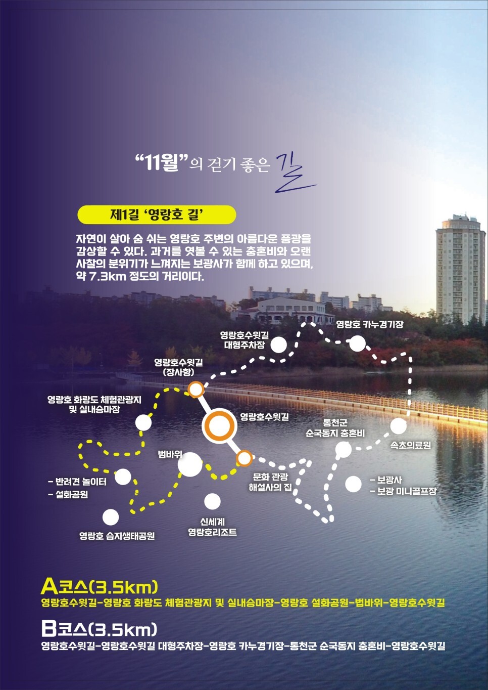 속초시에서 선정한 사잇길은 제1길(영랑호길)부터 제10길(대포만세운동길)까지 총 길이 42.1㎞이며, 구간별 특성이 있어, 걷는 재미가 있습니다.