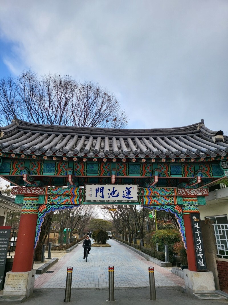 덕진공원은 덕진호를 중심으로 만든 시민공원입니다. 그래서 입장료 없이 들어가실 수 있습니다. 덕진공원 정문 현판에는 ‘연지문’이라고 적혀있습니다. 한옥으로 지어서 전주의 멋스러움이 더욱 부각시켜주는 것 같습니다.