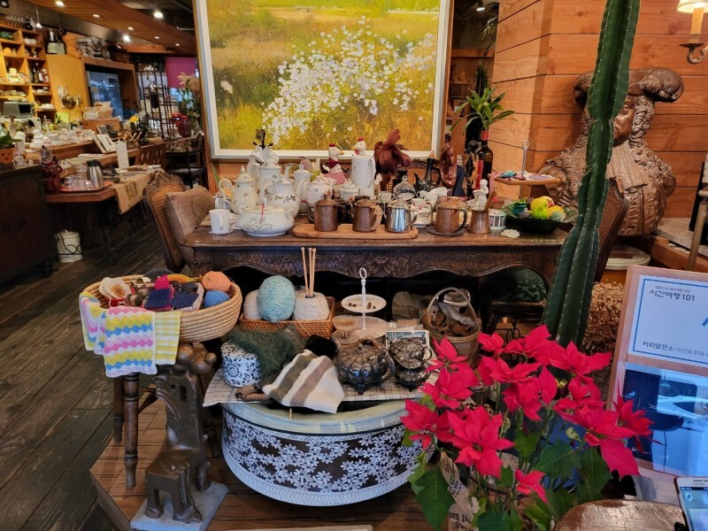 카페에 들어오면 다양한 장식품들을 볼 수 있는데요. 컵부터 시작해서 꽃들도 불 수 있고 흉상도 볼 수 있습니다. 그리고 장식품들 옆에 전라북도 여행지 안내지와 전주 여행지 안내지를 볼 수 있습니다. 이곳에서 커피를 마시면서 전라북도 여행과 전주 여행 계획을 짜보는 것도 좋을 것 같습니다.
