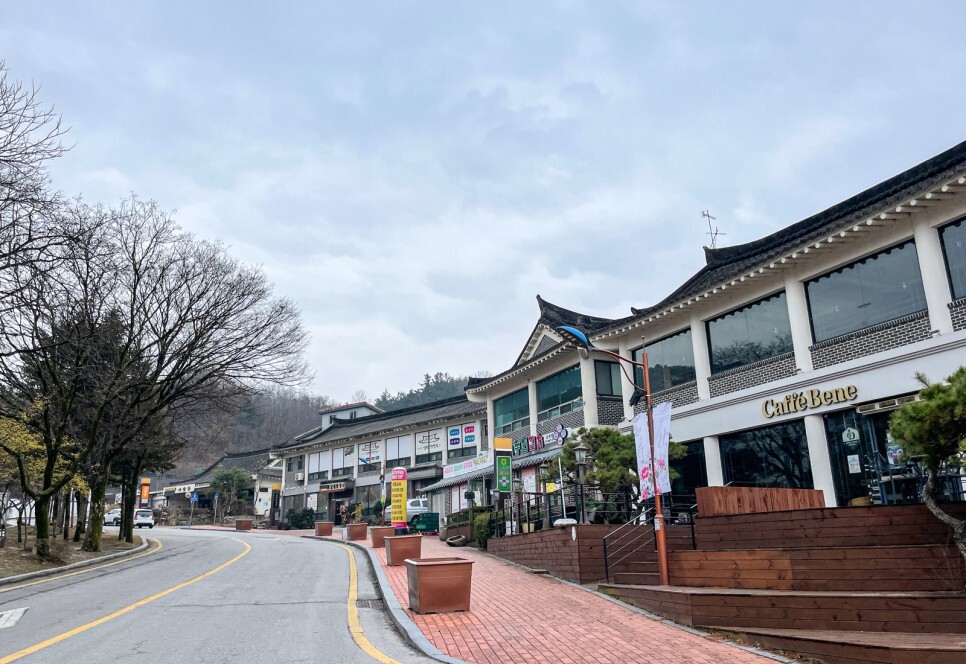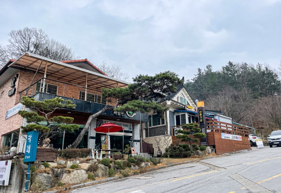 음식점들뿐만 아니라 아름다운 한옥 건물로 지어놓은 카페도 있었고요. 사방이 넓은 통창으로 되어 있어서 주변 경치를 바라보면서 여유롭게 차 한잔할 수 있는 공간이기도 했답니다.