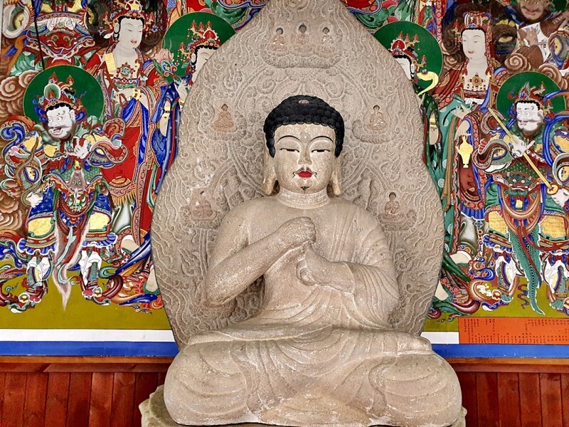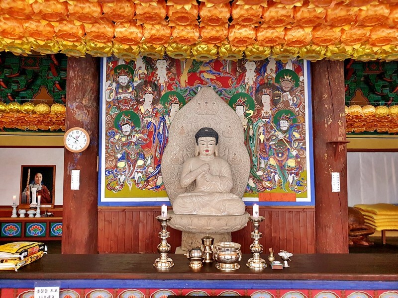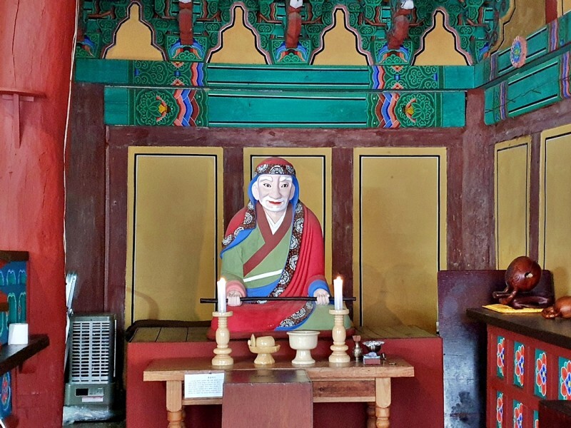 대웅전 안에는 삼존불이 모셔져있고 그 옆으로는 높이 1.3m의 소조 승려상도 함께합니다. 옅은 미소가 아주 친근하게 느껴졌는데 각연사를 창건한 유일 스님의 상이라는 설과 중국의 달마상이는 2가지 설이 전해지고 있었습니다.