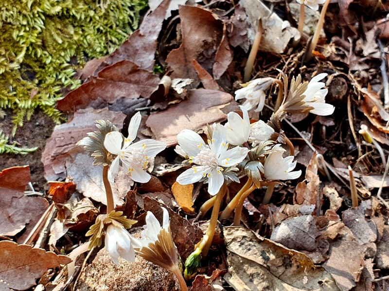 두어분이 자리를 뜨지못하고 한참을 머물기에 내려가보니 봄 야생화 너도바람꽃이 활짝 피었습니다. 해마당 봄이면 각연사 인근 계곡으로 많은 꽃들이 피어난다고 합니다. 올해는 각연사 초입 한 자리에서 발견되고 있었는데 많이 줄어든것이라고 합니다. 이름 봄에 피는 미나리아재비과의 야생화로 산지의 반그늘에서자라며 덩이줄기는 공 모양이고 수염뿌리가 많이있습니다. 길이 1cm 정도의 꽃대가 나와 곧게 서며 그 끝에 흰색 꽃이 한송이씩 피었습니다. 여린 줄기를 올려 꽃을 피운 모습에서 끈질긴 생명력이 느껴졌습니다