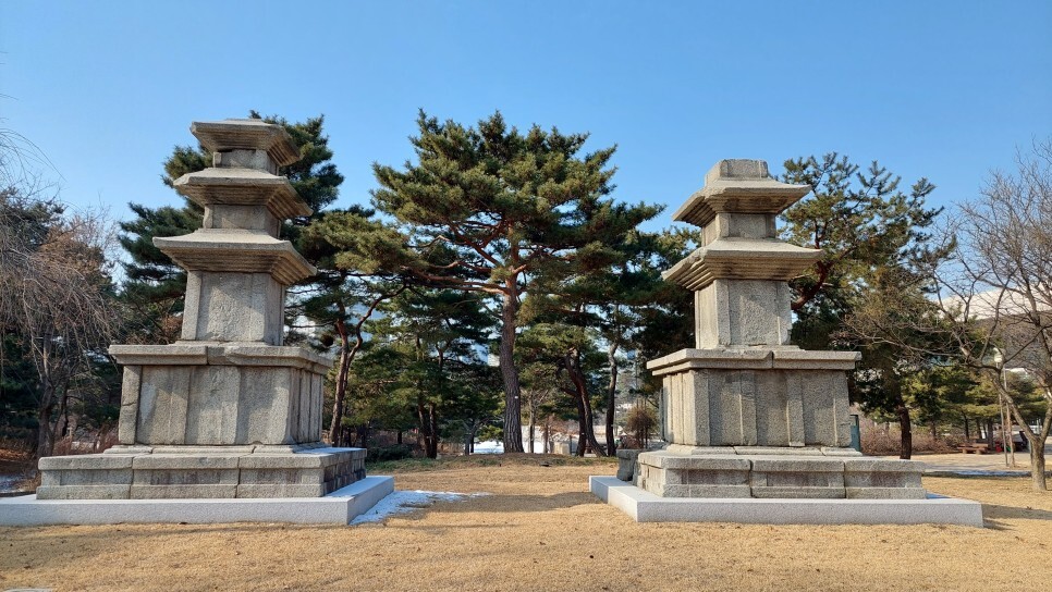 두 개의 석탑이 눈길을 사로잡습니다.
