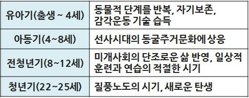 - 영아기, 유아기, 걸음마기, 감각능력기, 행동습득기, 집단교육기