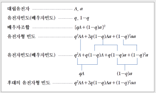 유전적 평형 : 세대가 진전하더라도 집단의 대립유전자빈도가 일정하게 유지되는 상태
