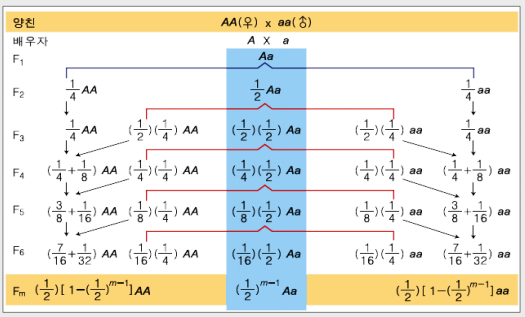 • 이형접합체(Aa)의 반복된 자식으로 열성 동형접합체(aa)의 도태