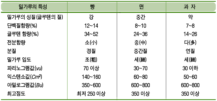 부질에는 글루텐 단백질이 관여하므로 글루텐의 양과 성질에 따라 밀가루의 용도와 이용범위가 결정됨