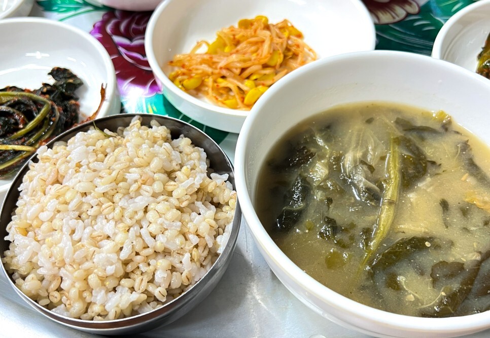 미역냉국과 시래기국으로 목을 축이고, 건강한 채소 반찬과 보리밥으로 편안한 식사를 즐겨봅니다.