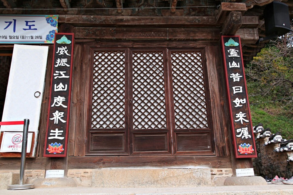 중악단 출입문에는 주렴이 걸려 있어요. 오른쪽 주렴은 "영산석일여래촉"으로 그 의미는 -오랜 옛날 영산회상 여래 부촉 받으시고 - , 왼쪽 주렴은 "위진강산도중생"으로 - 크신 위엄 갖추시고 중생 제도 하시어라- 는 의미입니다.