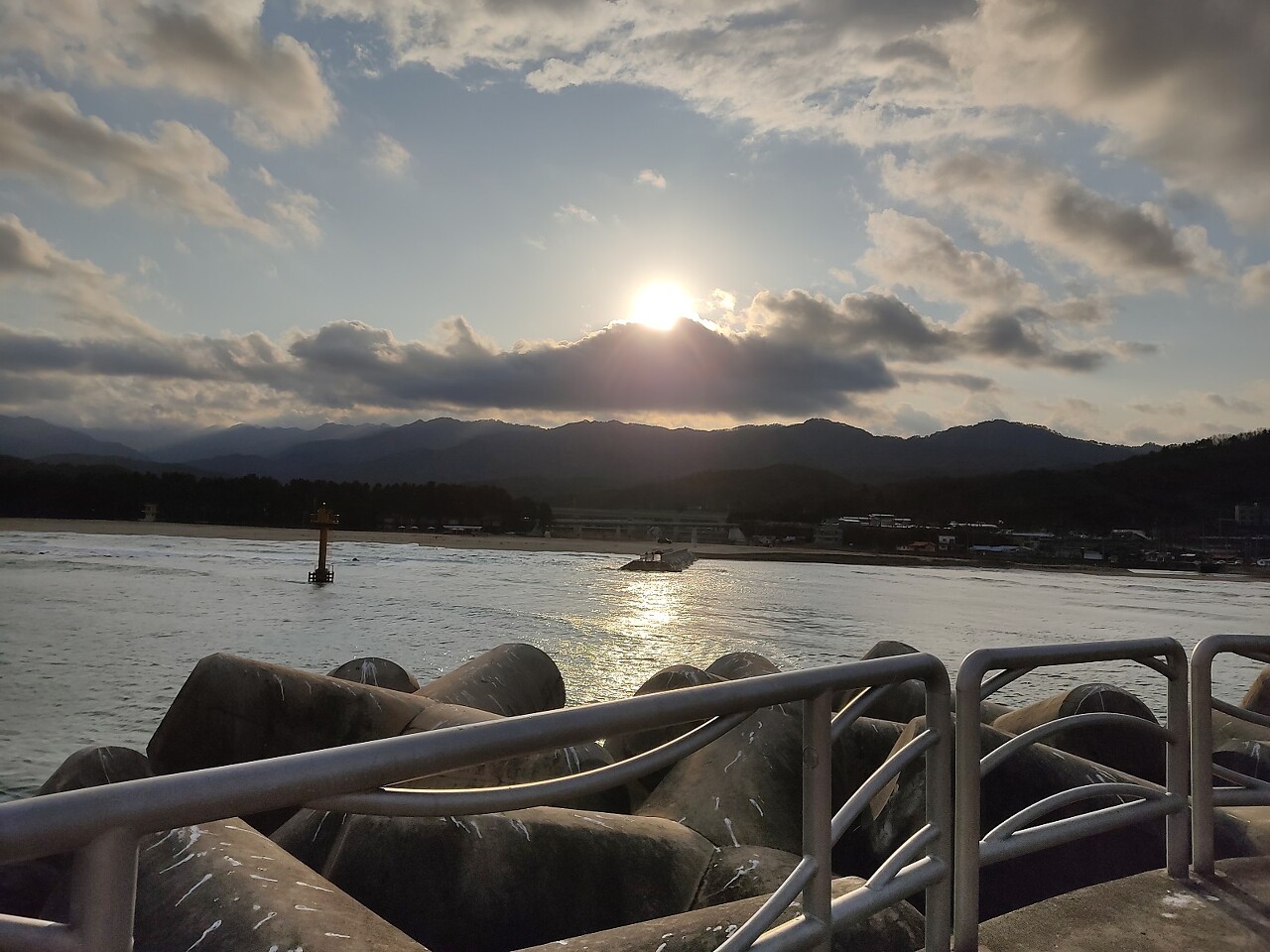 구름위로 떠 저물어가는 해와 윤슬입니다. 궁촌항구 쪽인데요 어선들도 보입니다.