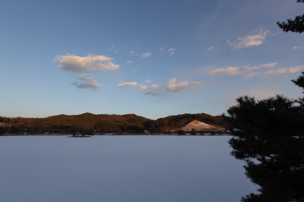 못은 얼어있었고 얼음 위에 내렸던 눈이 하얗게 덮여있고 하늘은 맑은 편이었습니다.