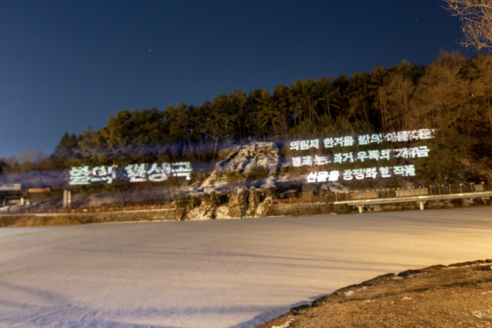 바닥에 “머물고 싶은 자연치유도시 제천”이라는 조명을 비추네요.