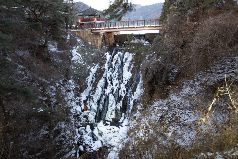 날이 밝을 때 용추폭포입니다. 물줄기 옆으로 눈이 수염처럼 내려진 모습이 인상적이었습니다.