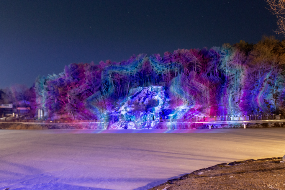 의림지에서는 365일 내내 인공폭포를 스크린 삼아 미디어 파사드를 상영합니다.