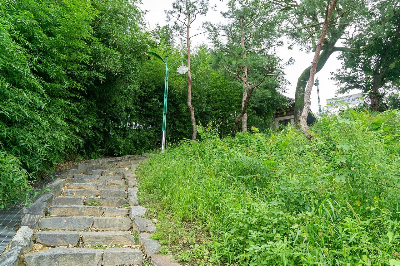 박범신 문학비 옆으로 황산(돌산전망대)으로 오르는 계단이 있는데요. 정상까지 50m라는 이정표로 보아 옥녀봉 43.9m와 비슷한 높이인 듯합니다. 장마 기간 동안 비가 많이 와서 계단이 젖고 이끼가 낀 곳도 있어서 조금 미끄러웠는데요. 방문하시는 분들의 주의가 필요합니다.