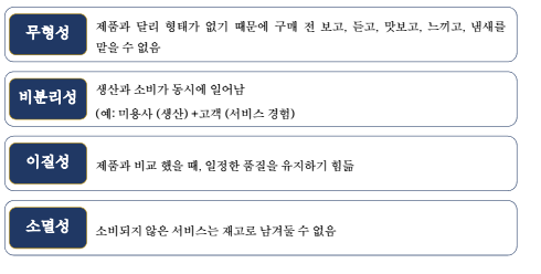 - 서비스는 생산과 소비가 동시에 일어나며, 판매되지 않으면 바로 사라지는