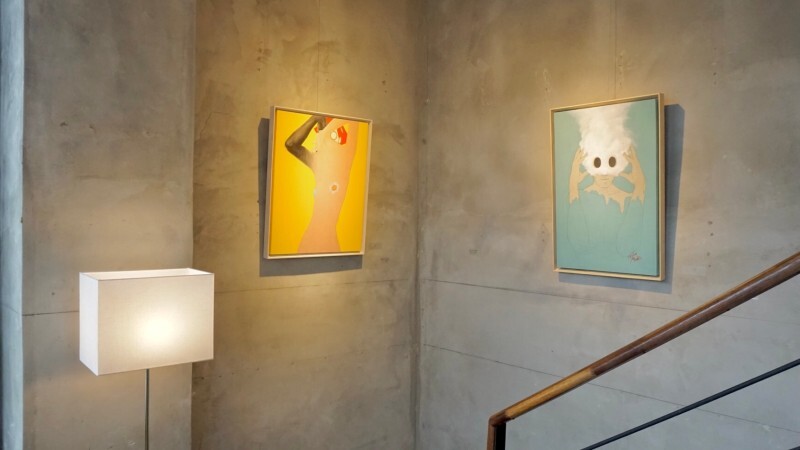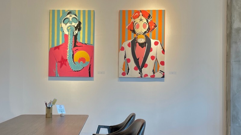 문을 들어서며 동시에 화려한 색채에 눈이 번쩍 뜨였는데요. 작품에는 주로 방독면을 쓴 인물이 등장합니다.