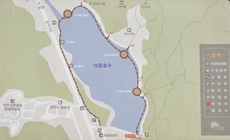 배도 채우고 전시회 관람도 했으니 아중호수 산책까지 마치면 야무지게 하루를 마무리할 수 있을 것 같은데요. 호수가 매우 큰 면적은 아니어서 한 바퀴를 다 돌아도 40분 정도가 소요된다고 해요. 시간 여유가 있다면 찬찬히 돌아보시는 걸 추천드려요.