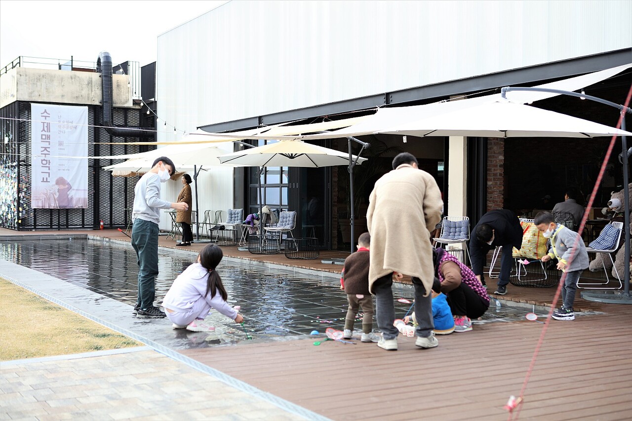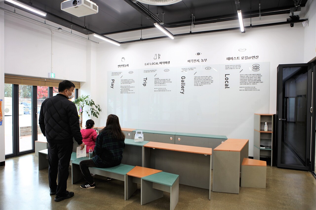 연산문화창고 중앙에 있는 건물은 커뮤니티홀이며 여기에서는 지역주민이 소통하고 수준 높은 문화활동을 즐길 수 있는 장소입니다. 연산문화창고 직원들이 사용하는 사무실도 여기 커뮤니티홀에 있답니다. 마침 아이들이 체험 수업을 하고 있어서 양해를 구하고 사진에 담아 봤습니다. 또, 한 공간에서는 아이와 부모님이 와서 즐거운 시간을 보내고 있었습니다. 수제 맥주 학교 운영으로 수제 맥주 마니아층 형성, 브루어리 전문가 양성 등 특화 프로그램을 추진하는 곳도 있네요.