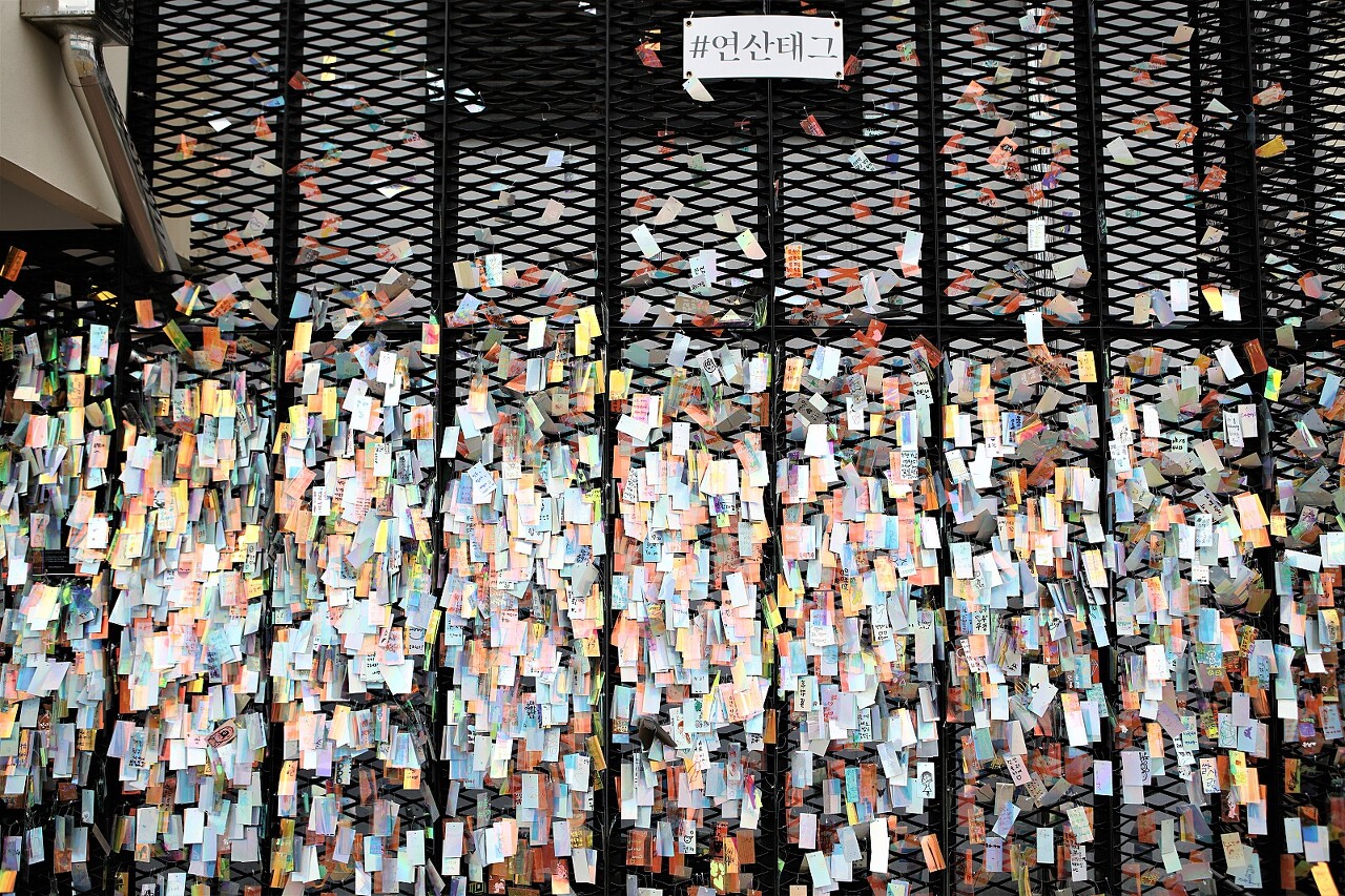 연산문화창고 2동 담벼락에는 여기를 방문하는 사람들의 소망을 담은 글귀가 수없이 많이 붙어 있었습니다. 가족의 건강을 비는 문구, 연인과의 사랑 문구, 행복하게 살 수 있도록 하는 소원을 비는 문구들 수많은 자기만의 소원을 글로 담아 여기에 붙어 있더라고요. 이렇게 수많은 글이 붙어 있는 담벼락을 보니 이것 또한 예술로 보입니다.